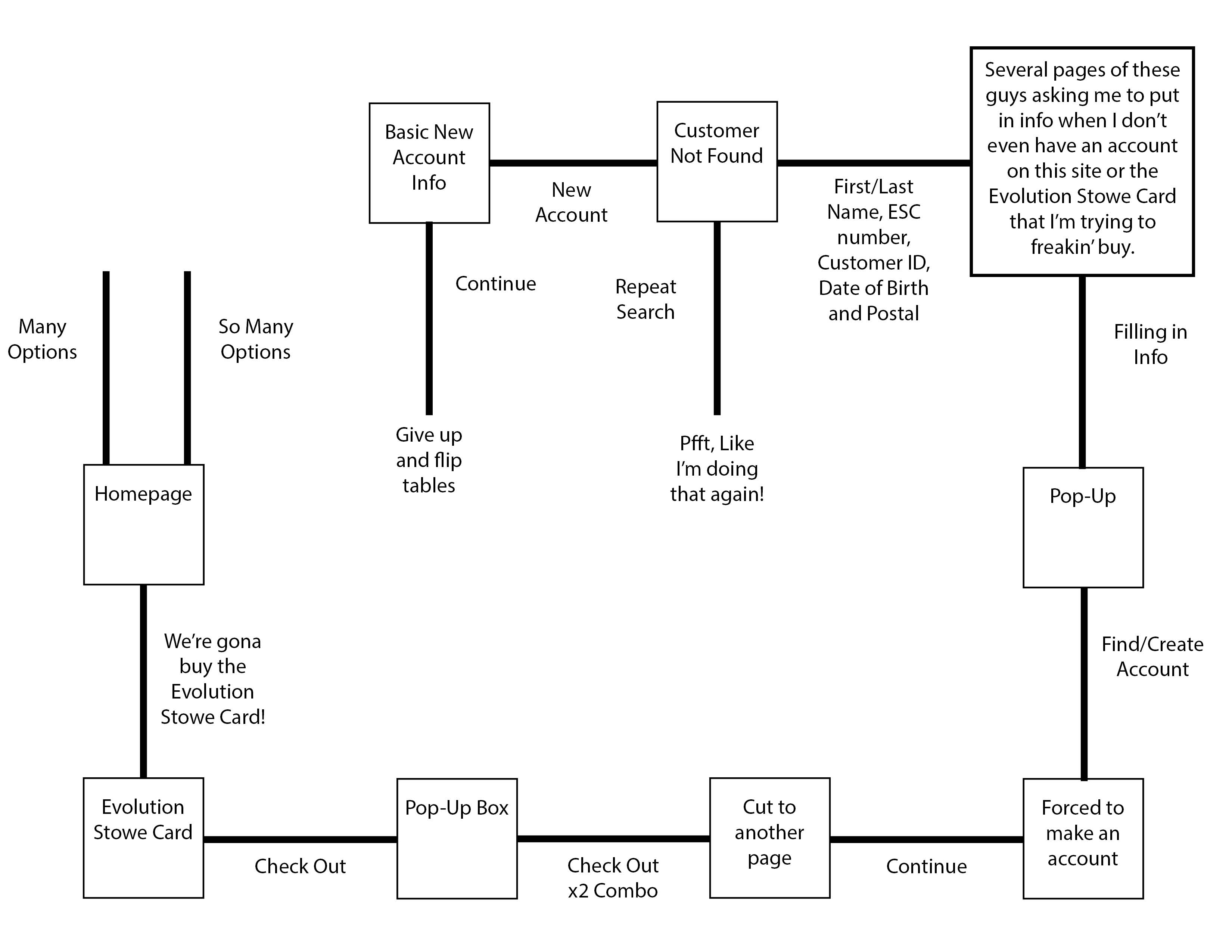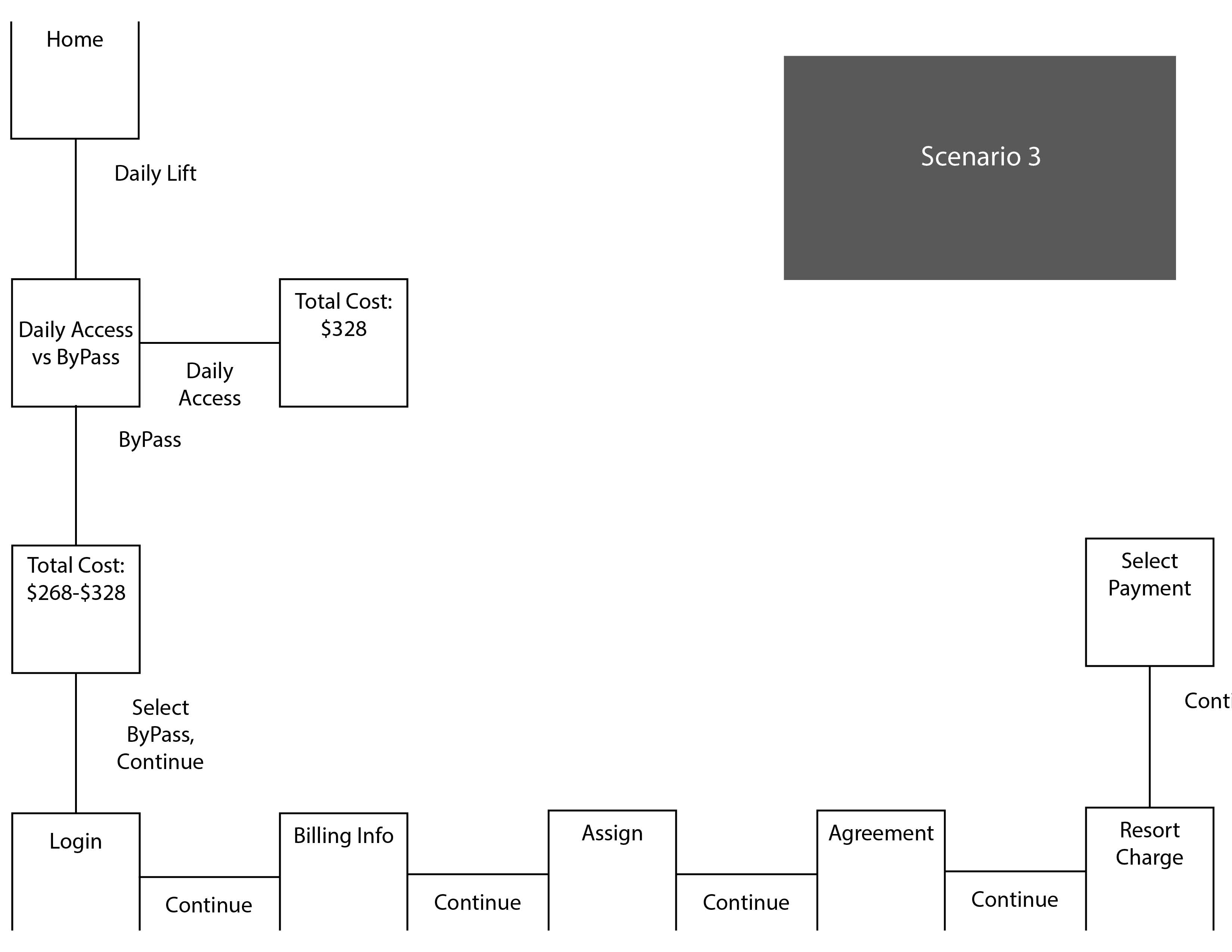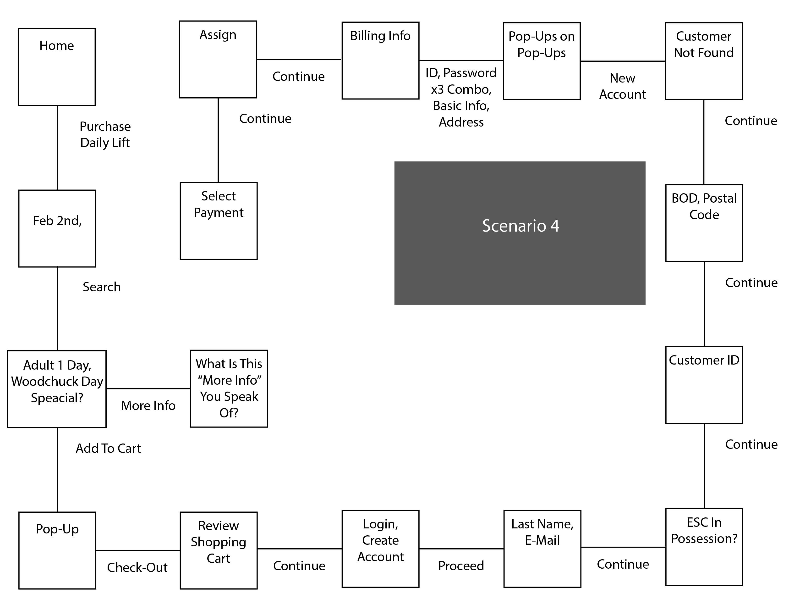 Based on class discussion, revise your original process flow and add a process flow for the following scenarios. Be sure to note any frustrations/confusion/questions at each step (to be fixed later).
