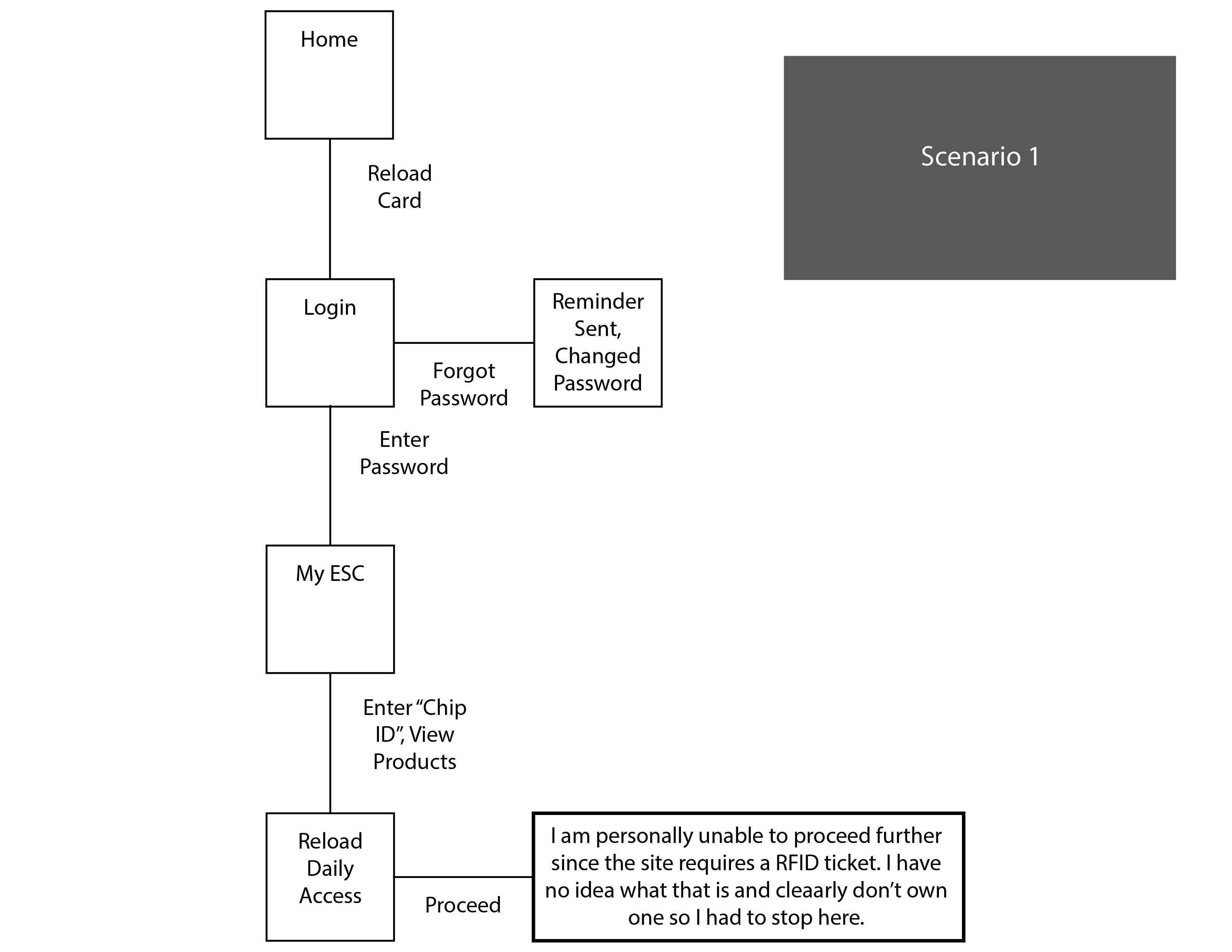 Login > Account, ESC, Can't figure out how to purchase ESC > Tickets, adds ESC, adds extra ESC, repeats step and correctly adds tickets instead > checkout