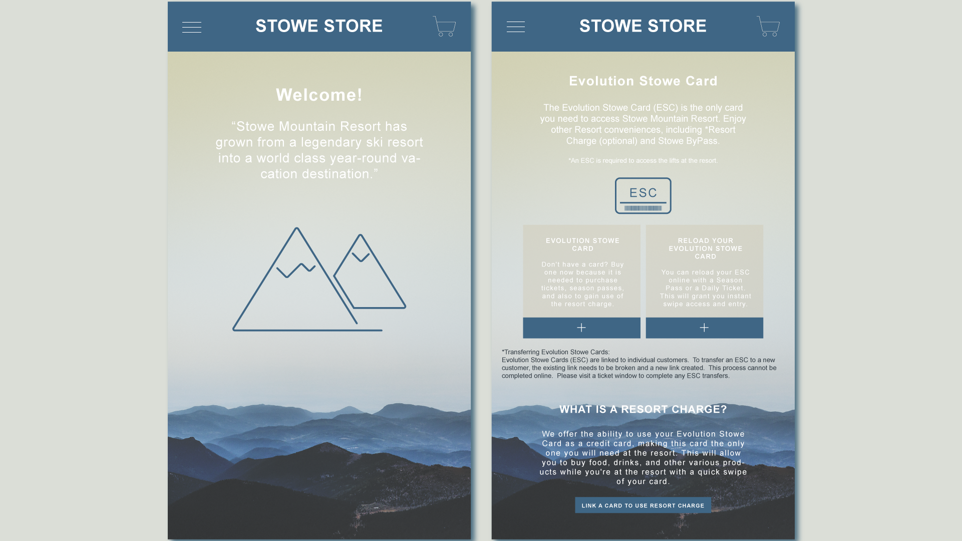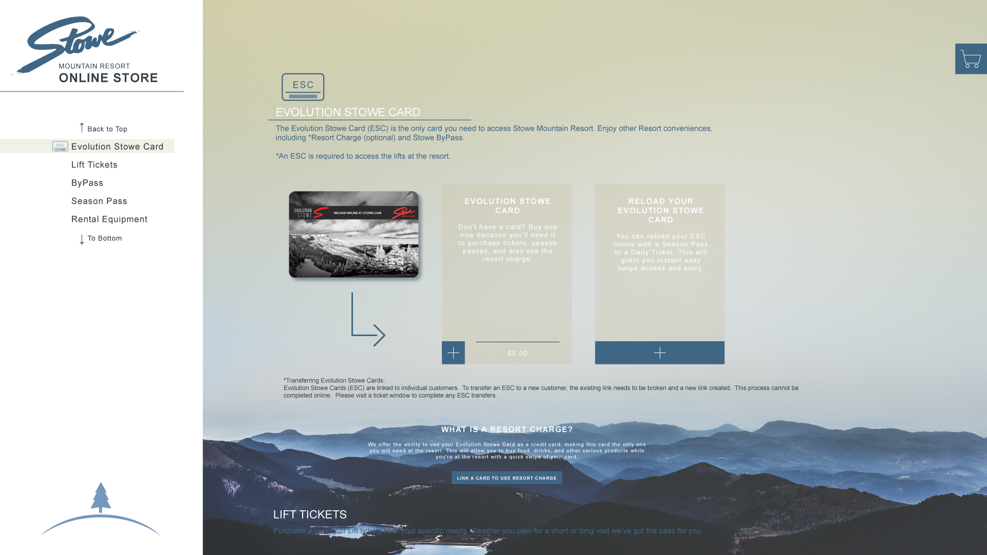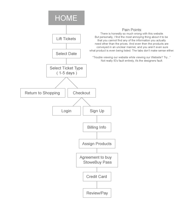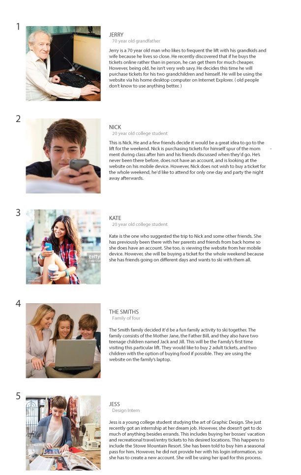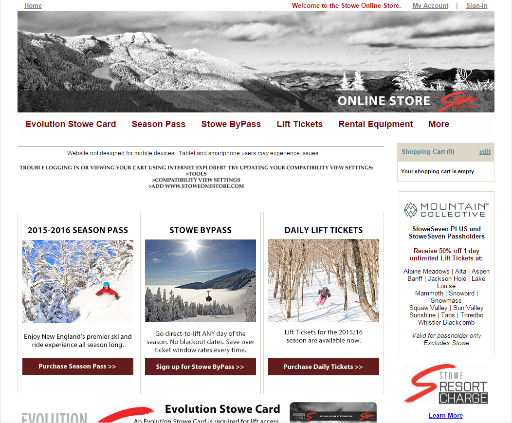 *1."You are an existing user who wants to ski for a day. You want to login and then reload your ( already owned ) Evolution Stowe Card." *2. "You are a new user who has no desire to make an account. You just plan to buy a ski ticket for one day and never return." 3. "You are the father of a family of five. You, your wife, and three children want to buy season passes for all days of the week. No one has an account or Evolution Stowe Card yet. However, you do not desire to make an account today." *4. "You are a new user who wants to ski for three days. You do plan to come back though, so you decide to make an account. You have to rent ski equipment for the days that you will be going. You do not own an Evolution Stowe Card." 5. "You are an existing user who is too lazy to login. You have been there before and just want to quickly reload you and your wife's Evolution Stowe Card with tickets for a day." *These are do-able on mobile as well. ( and were tested on mobile )