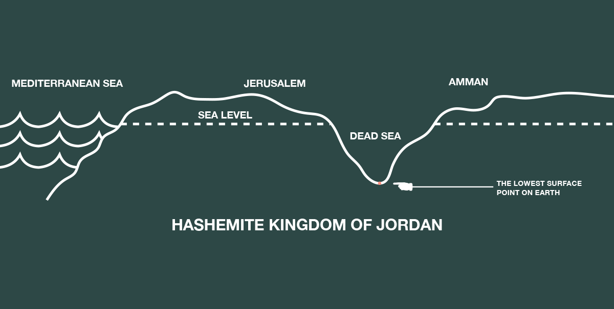 The Dead Sea (Arabic, Bahr al-Lut; ancient Greco-Romano, Lacus Asphaltites), the lowest surface point on the planet (the actual lowest point is under the ocean), is situated in the 350-mile-long (560 km) Jordan - Dead Sea rift valley, bordered by the Hashimite Kingdom of Jordan to its east, the State of Israel to its southwest, and the West Bank to its northwest. The surface of the Dead Sea is 1,302 feet (397 m) below Mediterranean sea level, with an area of about 395 square miles (1,020 sq km). It is 51 miles (82 km) long.