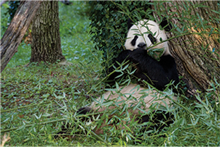 The rarest member of the bear family, pandas live mainly in bamboo forests high in the mountains of western China, where they subsist almost entirely on bamboo. They must eat from 26 to 84 pounds of it every day, a formidable task for which they use their enlarged wrist bones that function as opposable thumbs.