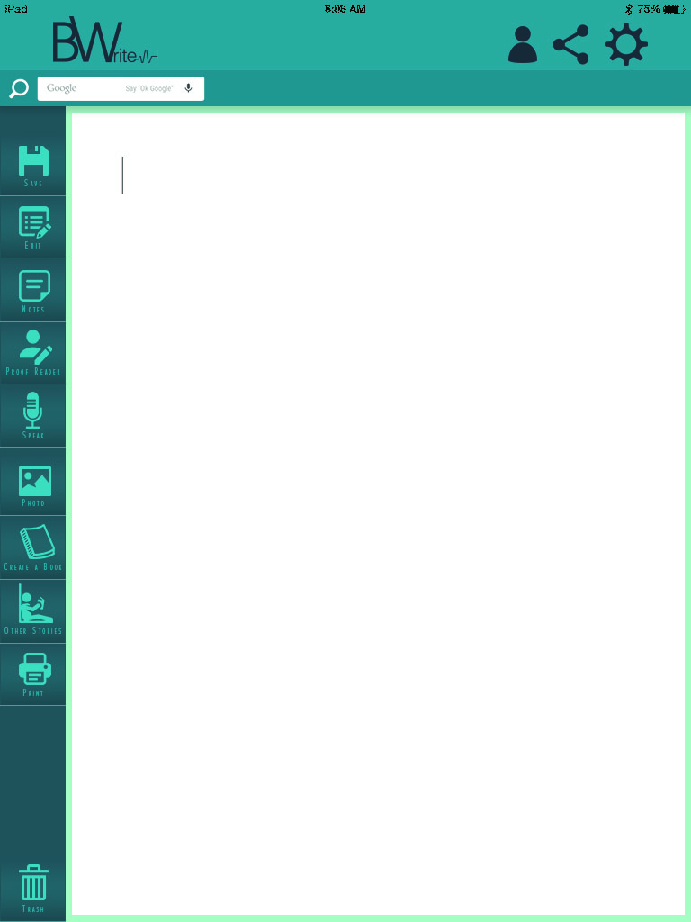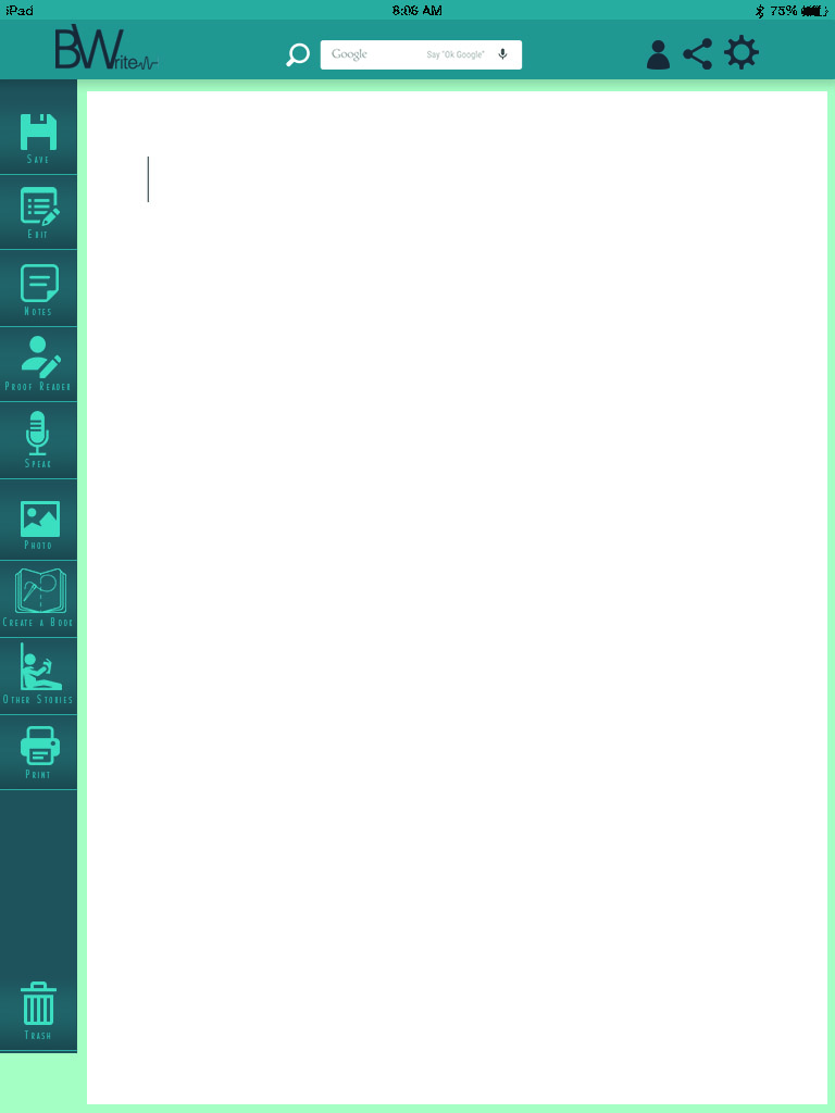 B Write is a writing app for a tablet whos main focuses is to help storytellers to write there stories easily. With the use of the microphone, writers can speak there stories out loud and B Write will right them down. B Write can also conect any writer to a proof reader/editor that has recommended qualification. B Write is also capable of setting up a file in a book format in any binding style that the writer prefers. Plus you can send your file to a local printer as well as your own home. To class up your document B Write has preset photos plus you have the oppion to choose from your own. And what's a writing app without editting capablities, so B Write will highlight any spelling, grammar, etc. errors.
