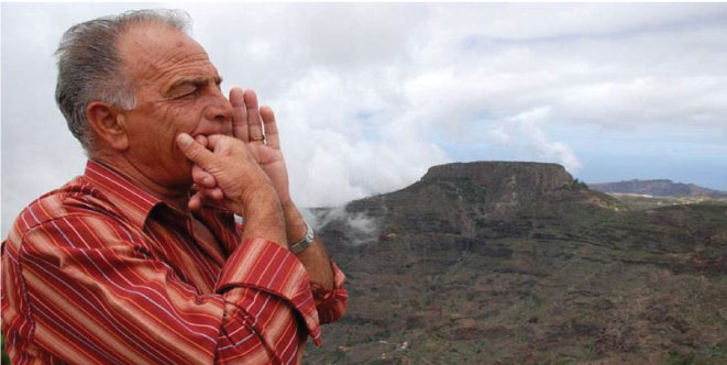 The night has not yet fallen in La Gomera, one of the smallest Canary Islands. From the top of the hill I can see, scattered in the distance, a few old houses. To my right, a row of black trees is a stark reminder of the fires that struck this Spanish island off the coast of Morocco last summer. I close my eyes to avoid being distracted by the landscape and make an effort to hear. I'm trying to discern, among the echo of the wind and the noise from the cars that from time to time drive along the road, the sounds of silbo gomero or Gomeran whistle, an ancient language the locals have assured me is still in use. This method of communication, in which the Spanish language is replaced by two whistled vowels and four consonants, has a peculiarity perfectly suited to this landscape of deep valleys and steep ravines. It has the ability to travel up to two miles (3.2km), much further and with less effort than shouting. There are no certainties about its origins. It is known that when the first European settlers arrived at La Gomera in the 15th Century, the inhabitants of the island - of North African origin - communicated with whistles. These whistles reproduced the indigenous language. With the arrival of the Spanish, the locals adapted the whistling language to Spanish. So the most likely theory is that the whistle came with the settlers from Africa, where there are records of other whistled languages.