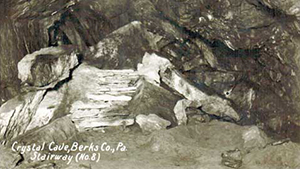 Interest in Crystal Cave was so great that as soon as Kohler leased the property he received word that a committee of men from a newly formed association of scientists, academic professionals, and enthusiasts of natural history were planning to study and report on the recently discovered cave in Richmond Township. They called themselves The Reading Society of Natural Sciences. For years Kohler reprinted their marvelous testimonial about Crystal Cave in various marketing promotions. In anticipation of his grand opening, Kohler labored fastidiously to remove unnecessary breakdown to create a suitable pathway inside the cave. He laid boardwalks and built wooden stairs and railings for safe passage.