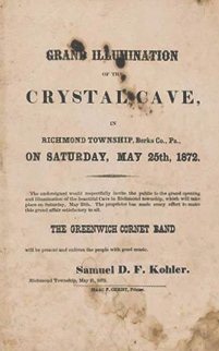 No one was allowed inside the cave unless Kohler accompanied them. The next month, 31-year old Samuel Kohler purchased the 47-acre farm,including Crystal Cave, for $5,000, and became Pennsylvania’s first full time cave operator. The formal deed of conveyance was recorded in the Recorder of Deeds Office of the Berks County Courthouse on April 1st, 1873, more than a year after execution of the sale. (Deed Book Volume 492, P. 621-623.)